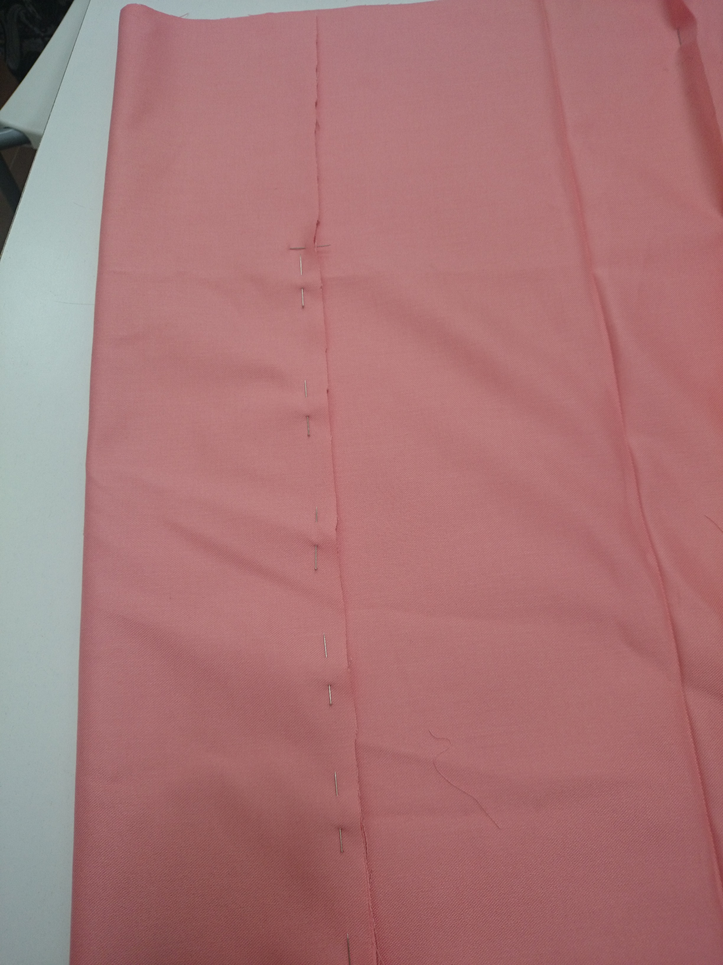 Al hacer una prueba, la profesora me sugirió añadir más tela. ¿Por qué? Porque apenas iba a tener vuelo, iba a quedar muy recta. Otro truquillo que aprendí 😉 Así que corté otro trozo de tela de 51 cm (este no era con la tela doblada) y la empalmamos al otro trozo de tela.