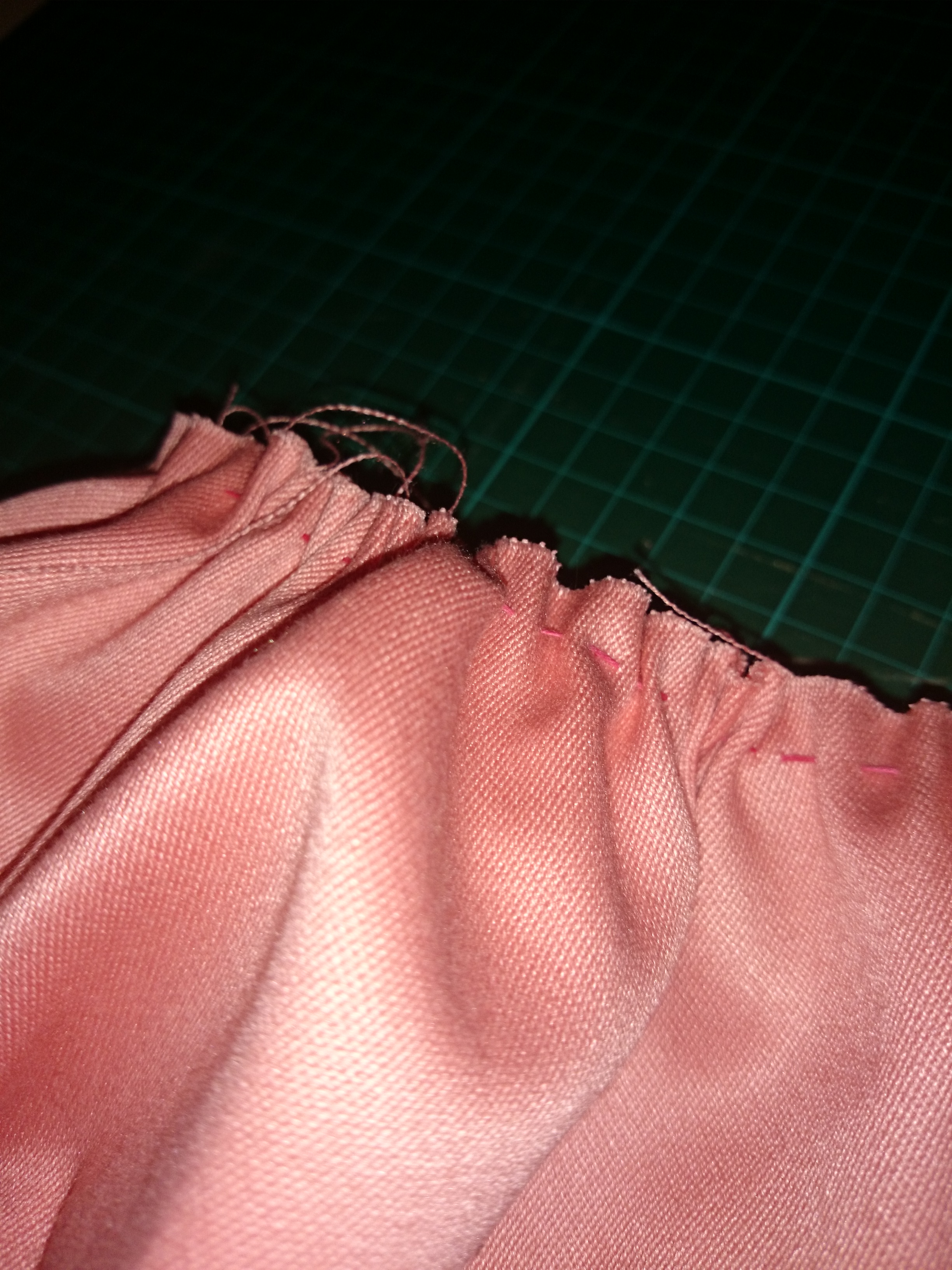 Comenzamos con el frunce, ¡yupi! Se hace con hilo doble y lo hice con hilo de hilvanar. He descubierto que el hilo de hilvanar es muy útil, al contrario de lo que yo pensaba. Es más debilucho, por lo que a la hora de quitar el hilván, es mucho más fácil. Y he aprendido que debe ser de un color que se vea bien, para luego poder quitarlo también con más facilidad.