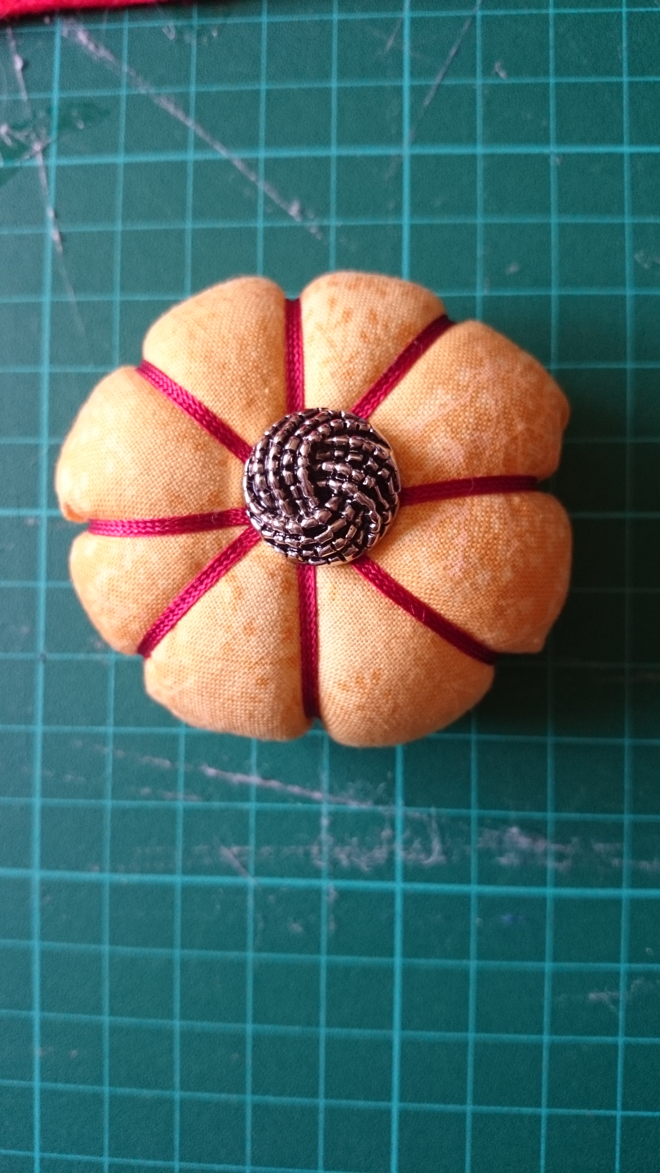 Por delante nos quedaría así de bonito. Veis que le cosí un botón muy cuco y que combina bien. El botón tenéis que coserlo antes de tapar la parte «fea», ya que tenéis que pasar la aguja atravesando por la mitad el alfiletero, para que quede más fijado. Intentad tirar lo que podáis, sin que se rompa el hilo, para que el botón os quede más pegado que a mí, porque me quedó bastante suelto.