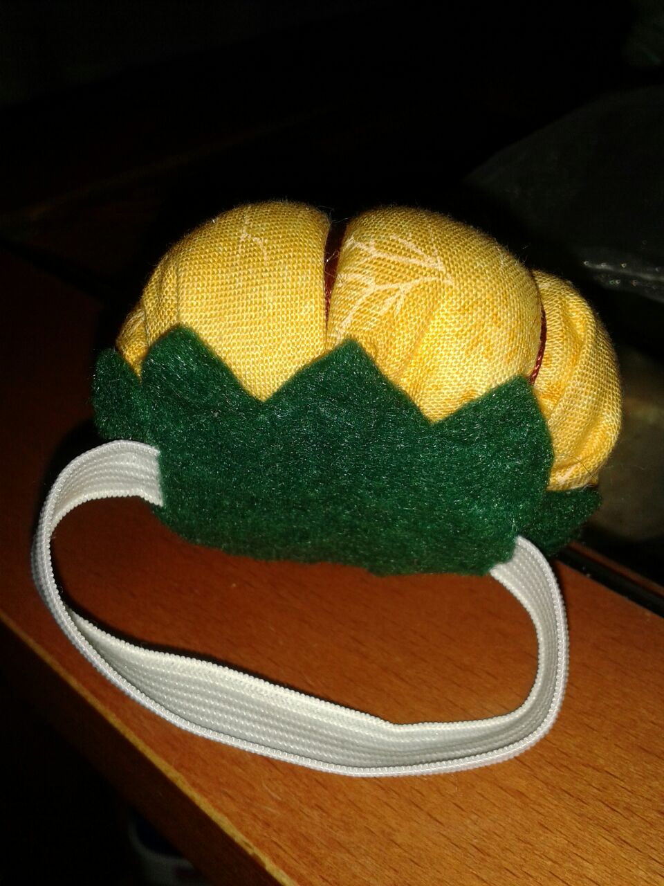 Para tapar la parte «fea», utilicé un trozo de fieltro verde, para emular las hojas de la calabaza. Recorté el trozo tomando la medida de la parte que quería tapar, y luego hice unos cortes para pasar la goma y que quedara todo bien integrado. Para coserlo, sujeté el trozo de fieltro por la parte del centro con un alfiler, y cosí todo lo de alrededor con puntada escondida. Como veis, las puntas de las hojas no las cosí para que quedaran más graciosas.