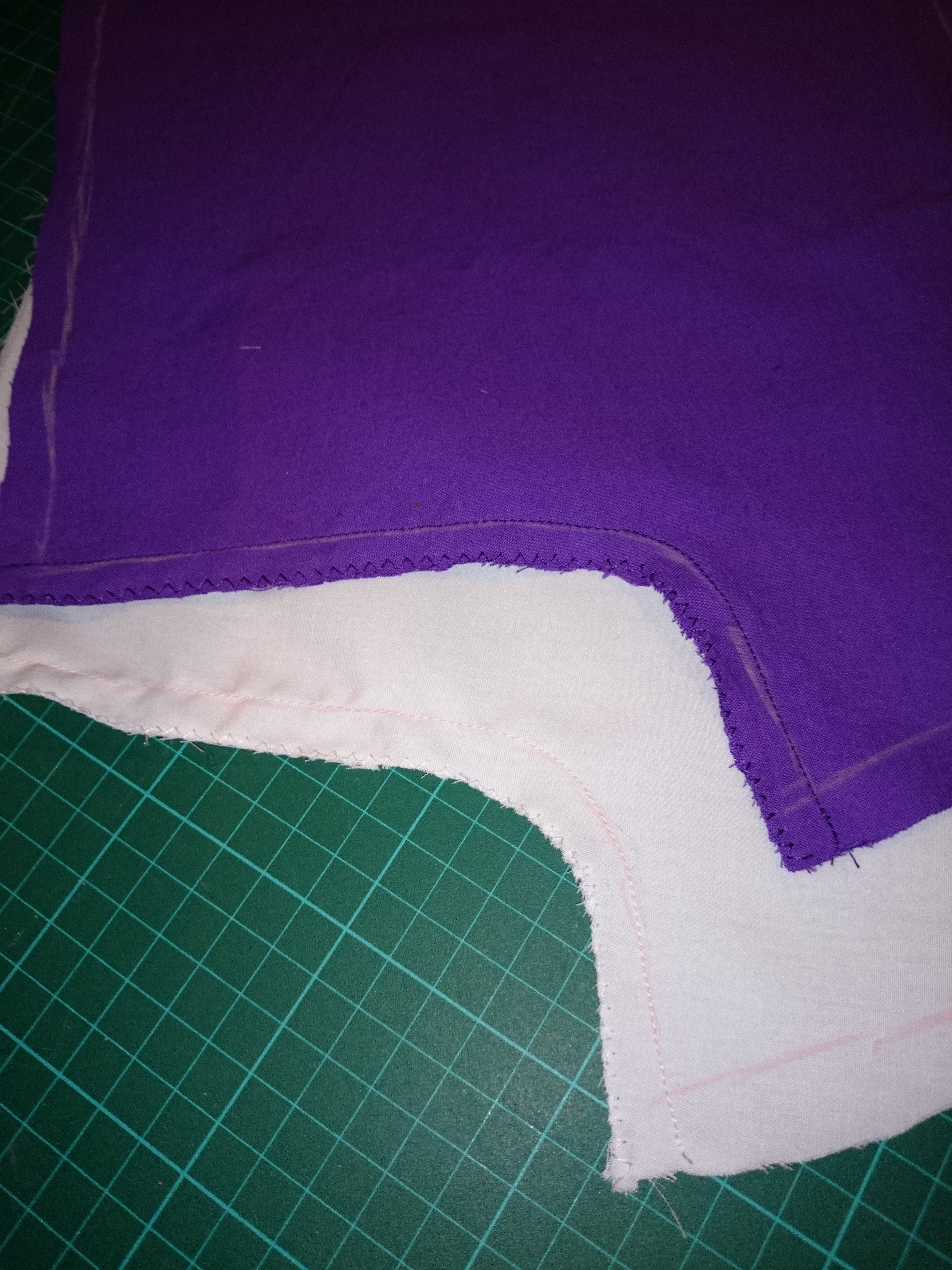 El siguiente paso es empezar a coser, ¡yuju! Vamos a coser la parte delantera por el centro, esto es, por la parte que hace la curva y después continúa recto. En la foto lo veis claro. Lo hacemos primero con la tela y luego con el forro, por separado. Si os fijáis, la costura está rematada con una puntada en zig-zag. Te hace el efecto (más o menos) de una remalladora pero sin necesidad de tenerla.