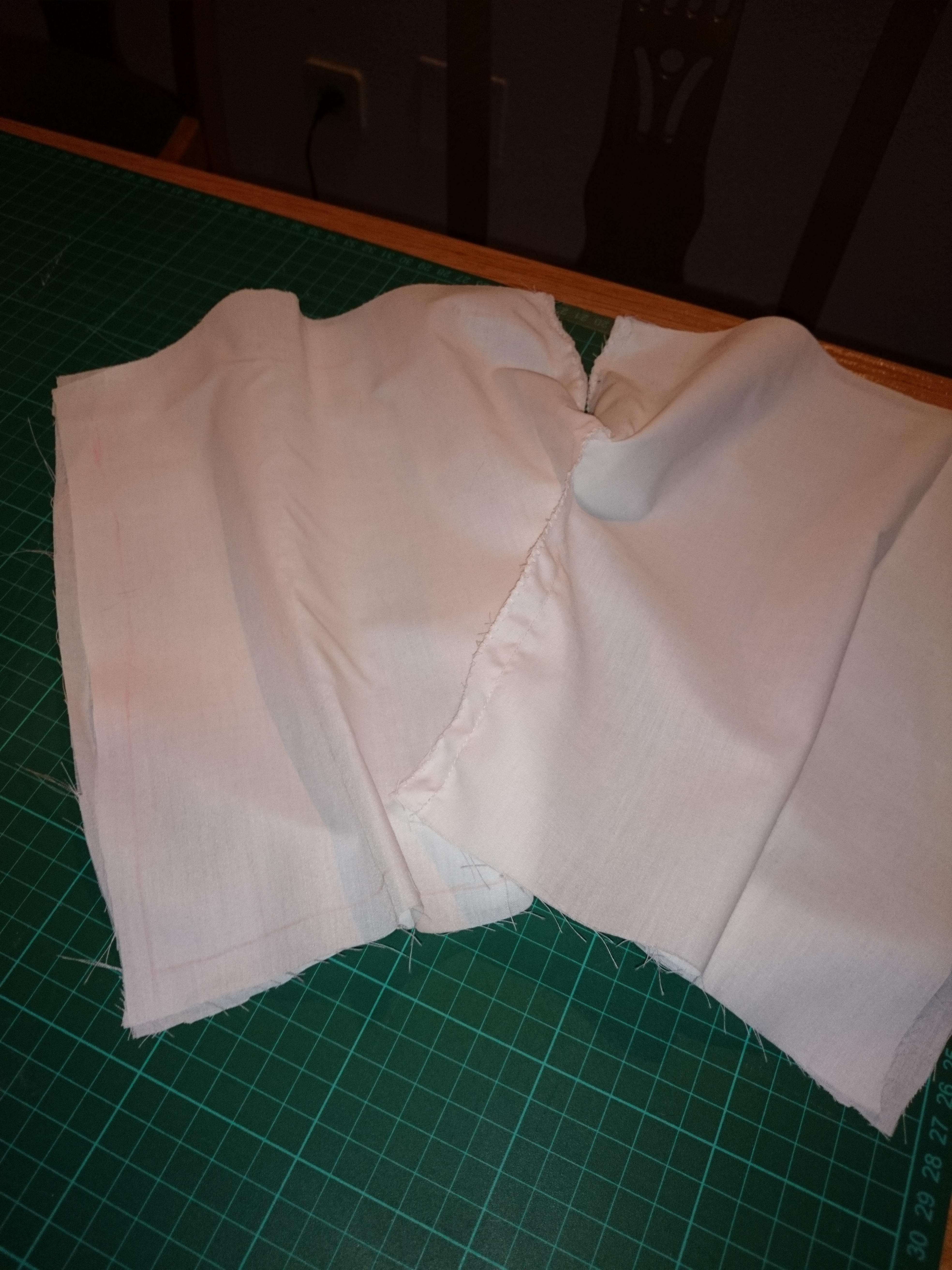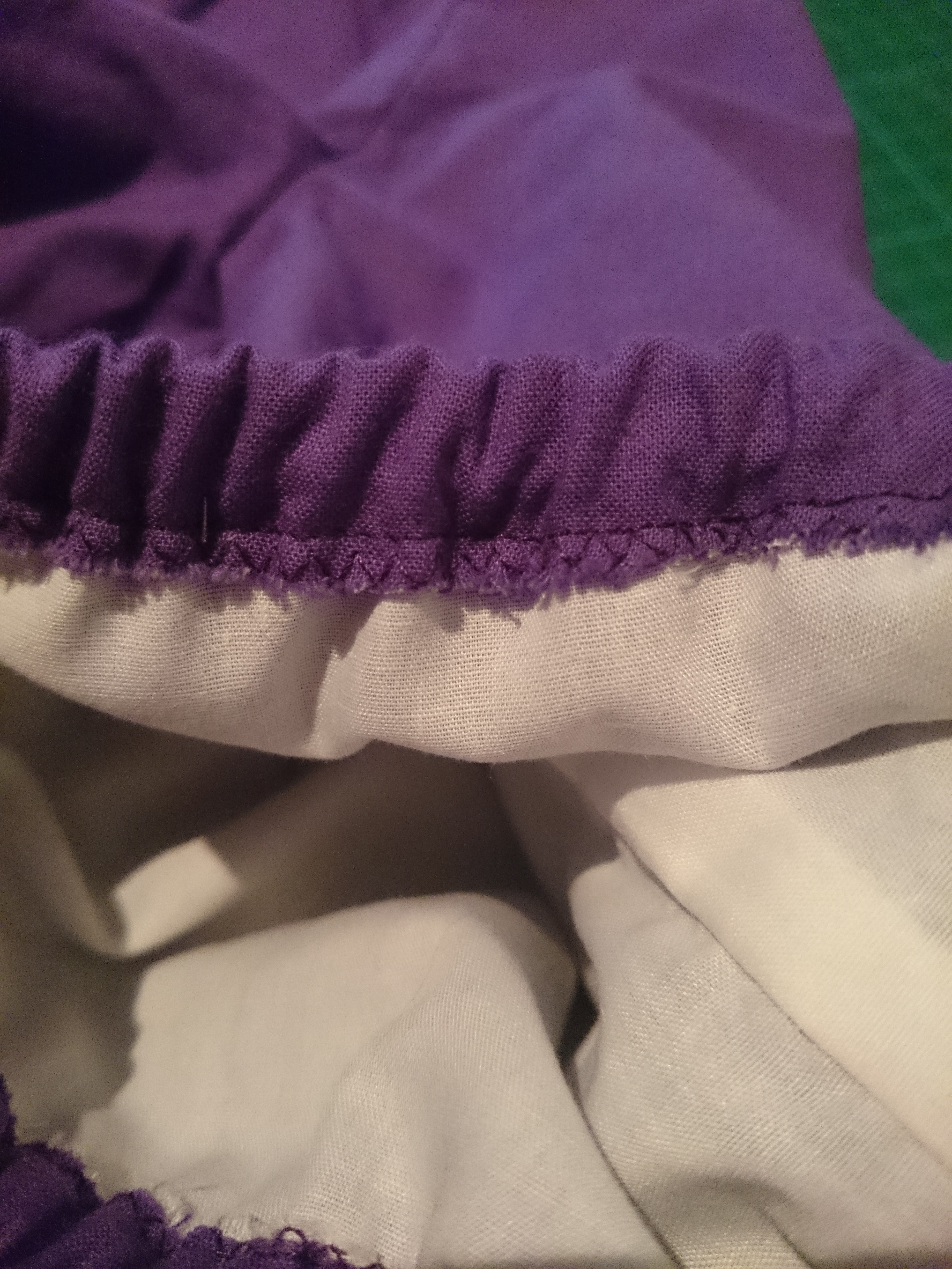Lo siguiente me resultó un poco complicado, pero haciéndolo despacito y con buena letra, al final sale. No tengo fotos de estos pasos (maldita sea mi ansia…), pero en el enlace que tenéis arriba lo podéis ver bien. Se trata de coser una puntada que sujete la goma, pero sin llegar a coser ésta. Esto conlleva ir estirando bien las dos capas de tela (tela y forro) para que no haga pliegues y, a la vez, ir estirando la goma. Hay que tener mucho cuidado y hacerlo despacio para que no nos quede nada raro al terminar. El resultado es éste.