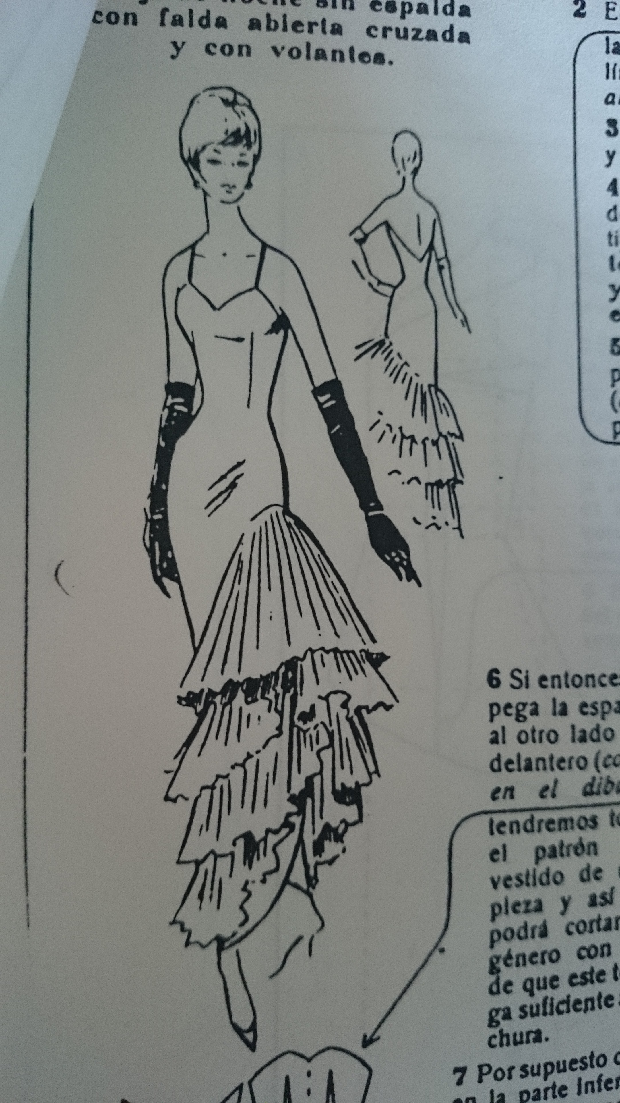 Sé que no es exactamente igual al modelo que encontré, pero básicamente, se realiza igual. La diferencia está en que el de los apuntes tiene más volantes y poco más. Como guía me valía perfectamente. Fue genial descubrir que venía cómo hacer el patrón (¡Aleluya!) y que además me veía capaz de hacerlo. Aquí lo podéis ver