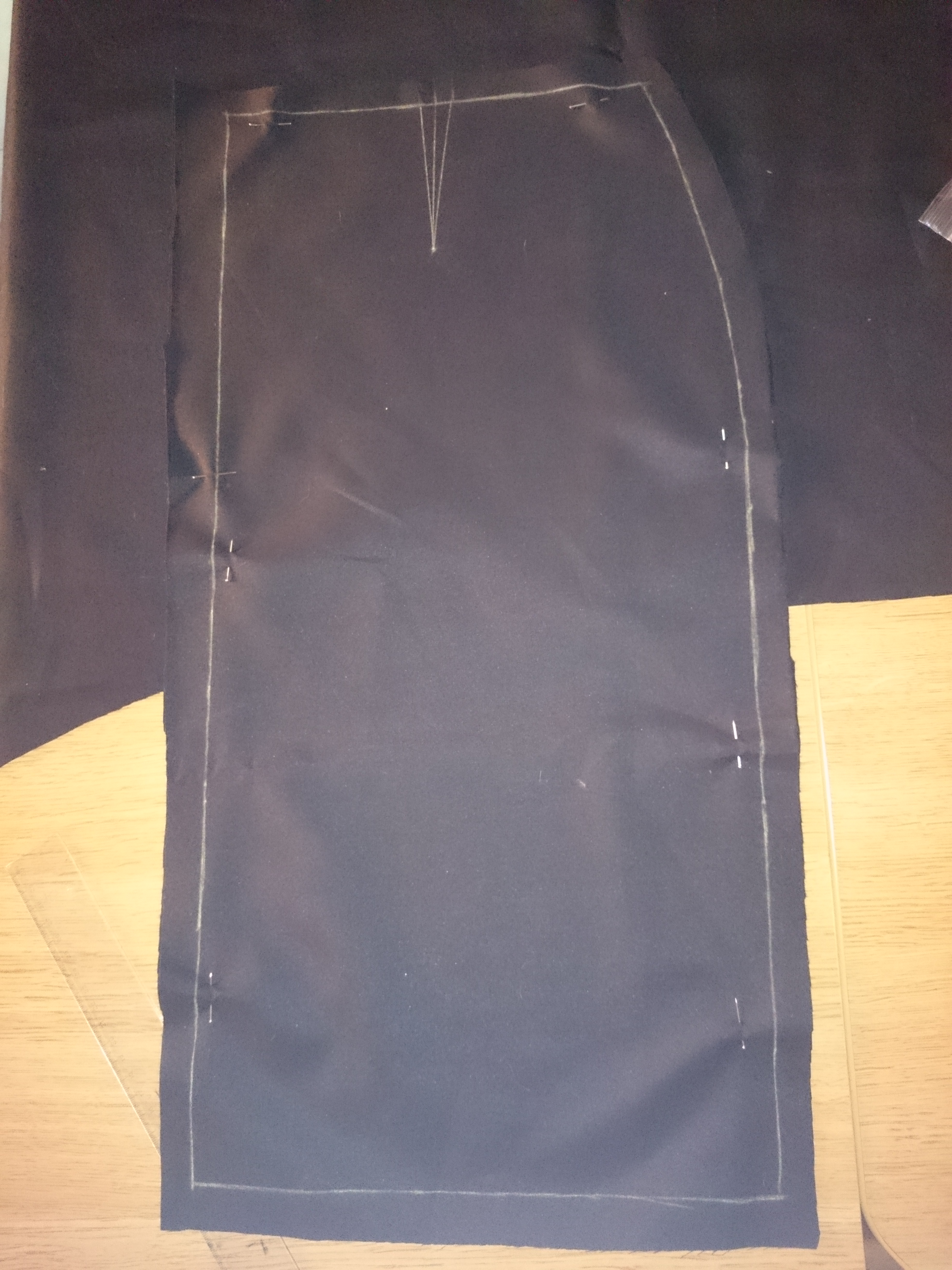 En esta foto os enseño un detalle importante. Cuando marcamos con jaboncillo, también tenemos que marcar dónde van las pinzas. Cuando he cortado la tela, le he hecho unos piquetes donde van las pinzas (fijándome en el dibujo del patrón). Después, para pasar del patrón a la tela el punto de unión de la pinza, he pasado un alfiler y lo he marcado con jaboncillo. Luego con una regla, unimos el punto con los piquetes, y ya tenemos pasadas las pinzas. Con ese truco podéis pasarlas en las dos partes de la tela, así queda todo mejor cuadrado.